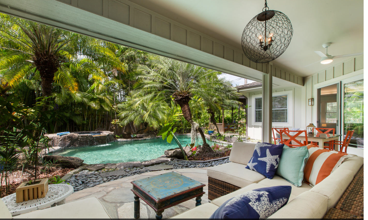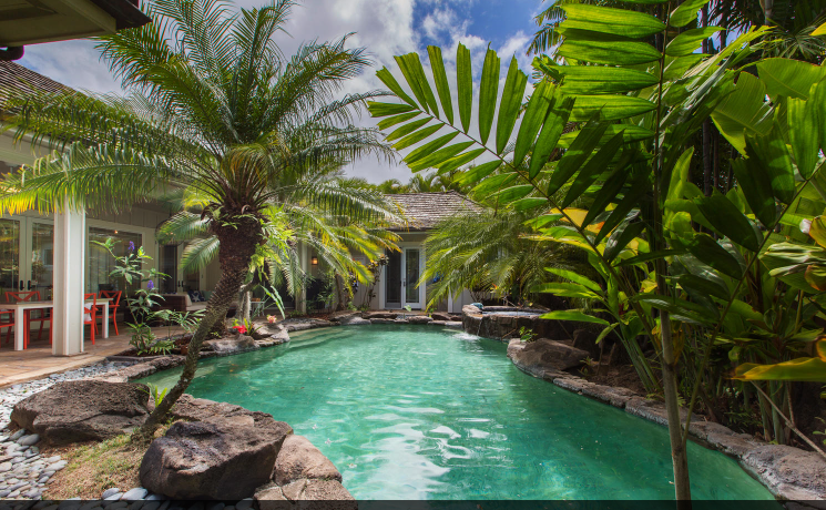 ラニカイビーチに近いプライベートプール付きの邸宅。バックヤードの庭は熱帯植物園