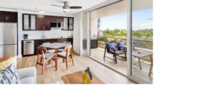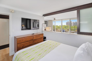 こんなところにキッチン付きのコンドミニアムありましたっけ?というほどワイキキの真ん中、便利な場所にあるコンドミニアムRegency on Beach Walk。目の前が低層のホテルなので思った以上に眺めがよくて公園の緑、高層階ならオーシャン&シティビュー。かなりのお部屋から金曜の花火も見えます。朝ごはんはお部屋のラナイで食べても気持ちよい眺めです。1ベッドルームは4名まで、2ベッドルームもございます。プールは近くのアウトリガーリーフのプールが使えます。